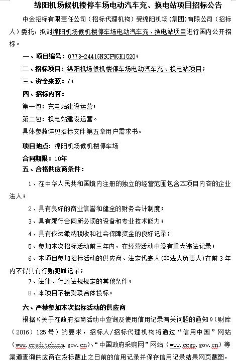綿陽機場候機樓停車場電動汽車充、換電站項目招標(biāo)公告