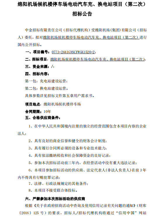 綿陽機場候機樓停車場電動汽車充、換電站項目(第二次)招標公告