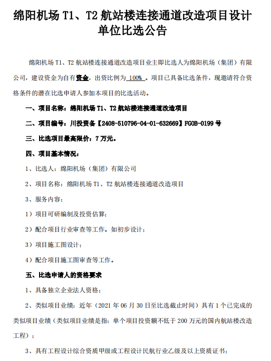 綿陽機(jī)場 T1、T2 航站樓連接通道改造項目設(shè)計單位比選公告